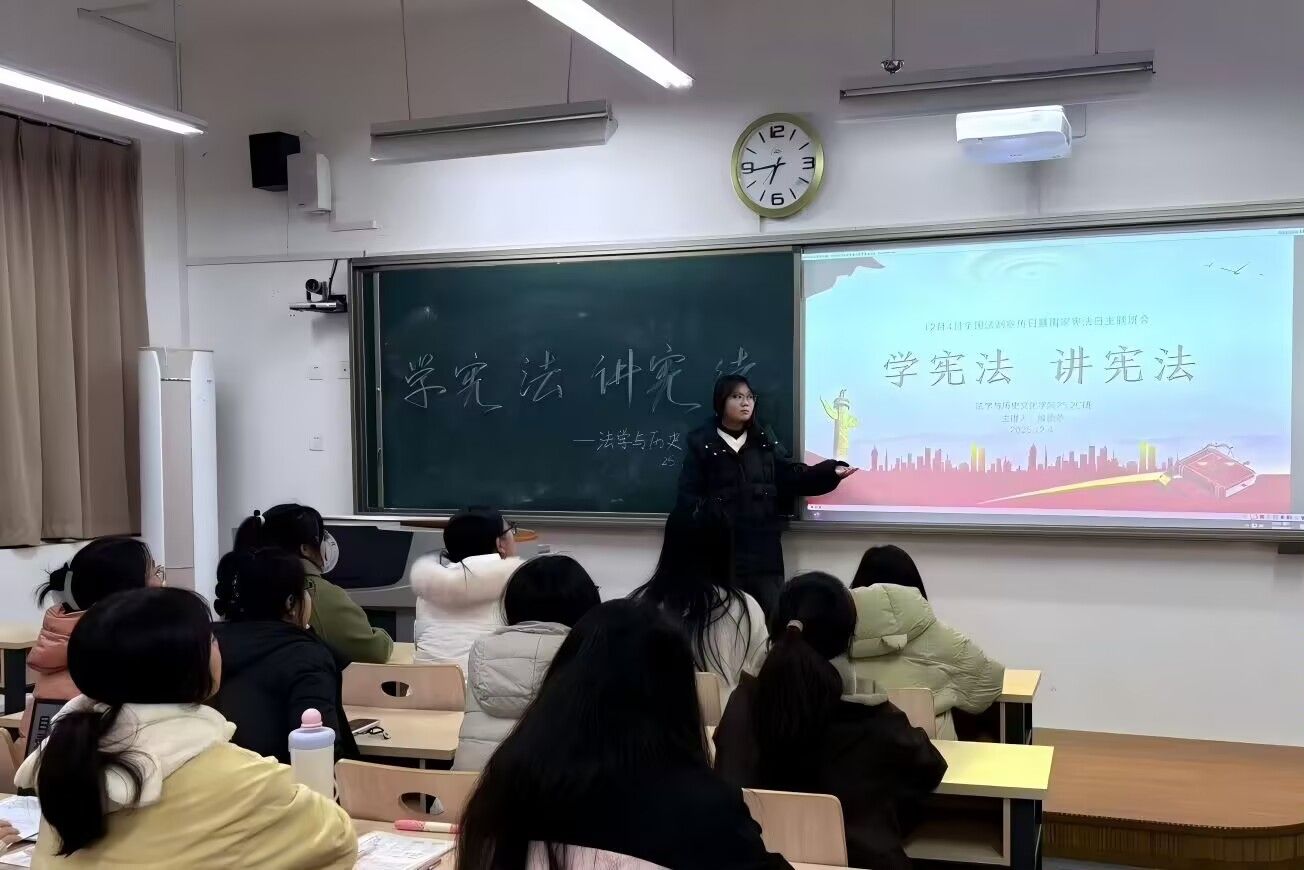 在班会上,班主任首先阐述了宪法作为国家根本法的重要地位,并结合学院学科特色,从法学与历史双视角解析宪法地位及其历史渊源,深化学生对宪法的认知。在讨论互动环节中,同学们积极交流、深入思考,进一步树立“学法、懂法、守法、用法”的自觉意识。最后,班主任进行总结,强调宪法教育对于法治人才培养的重要性,并鼓励同学们自觉维护宪法权威。