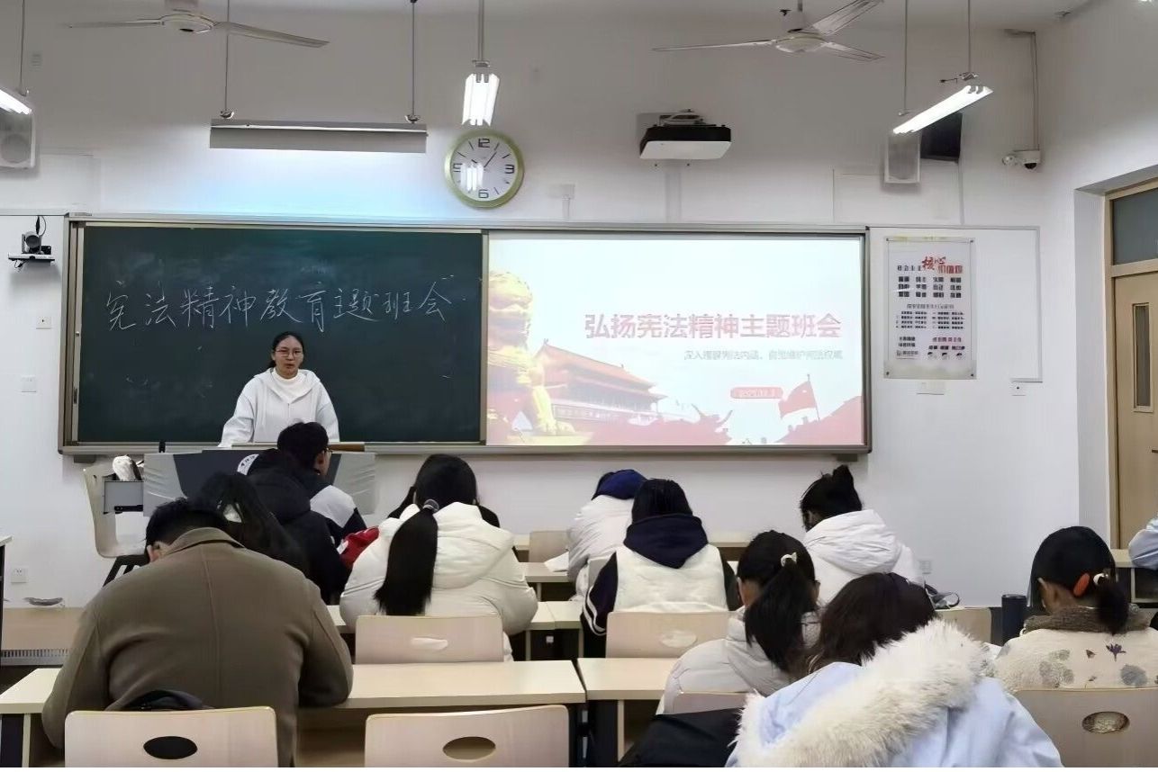 为深化同学们对宪法的认知与尊崇,进一步弘扬宪法精神,我院各班于12月4日在明德楼各教室相继开展了以“宪法为基·法治铸魂”为主题的班会活动,此次班会由各班主任主持,全体同学积极参加。
